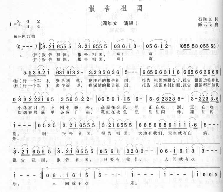 报告祖国简谱上传者为网友上传,原创作者为网络转载,歌曲原唱歌手为佚名,本简谱为图片格式,表现形式为,音乐性质为流行金曲。