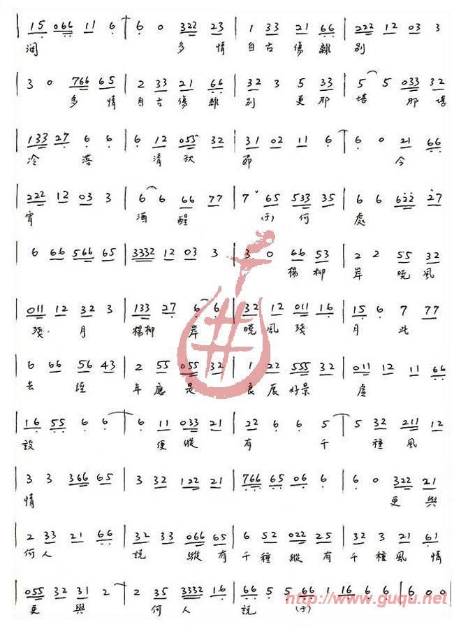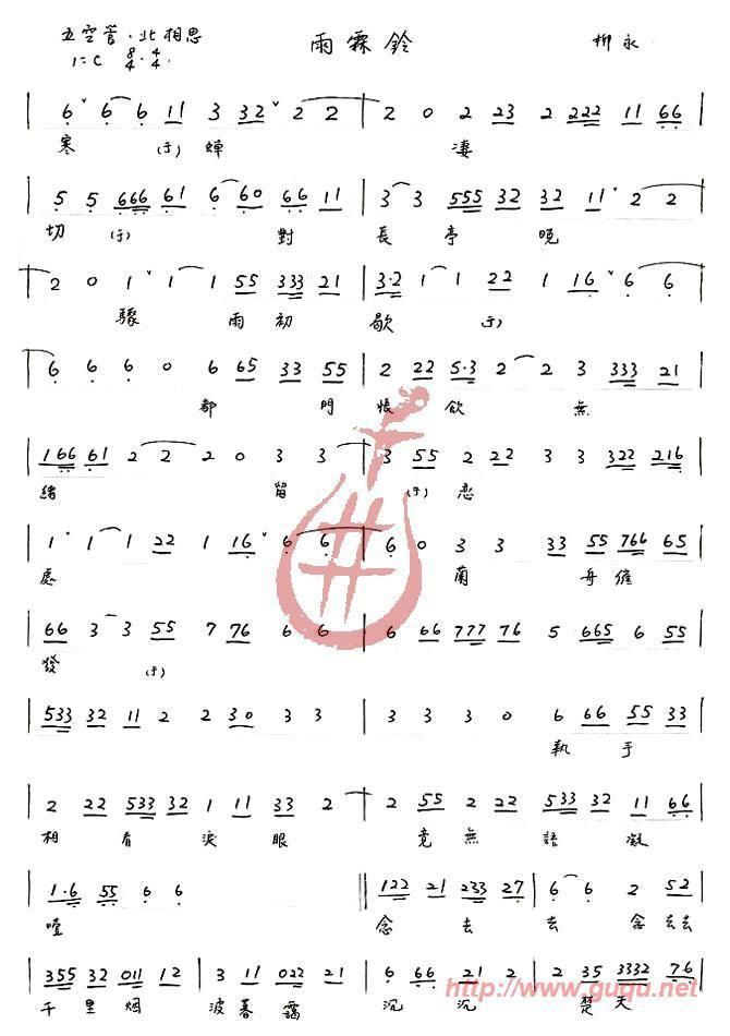 雨霖铃 南音简谱上传者为网友上传,原创作者为网络转载,歌曲原唱歌手为佚名,本简谱为图片格式,表现形式为,音乐性质为流行金曲。