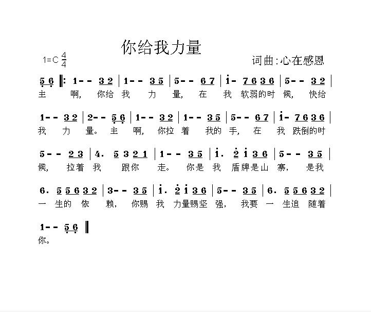 你给我力量简谱上传者为网友上传,原创作者为网络转载,歌曲原唱歌手为佚名,本简谱为图片格式,表现形式为,音乐性质为流行金曲。