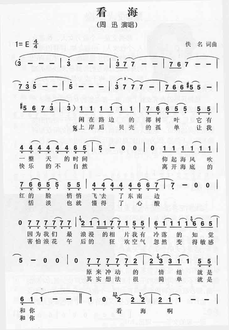 看海简谱上传者为网友上传,原创作者为网络转载,歌曲原唱歌手为佚名,本简谱为图片格式,表现形式为,音乐性质为流行金曲。