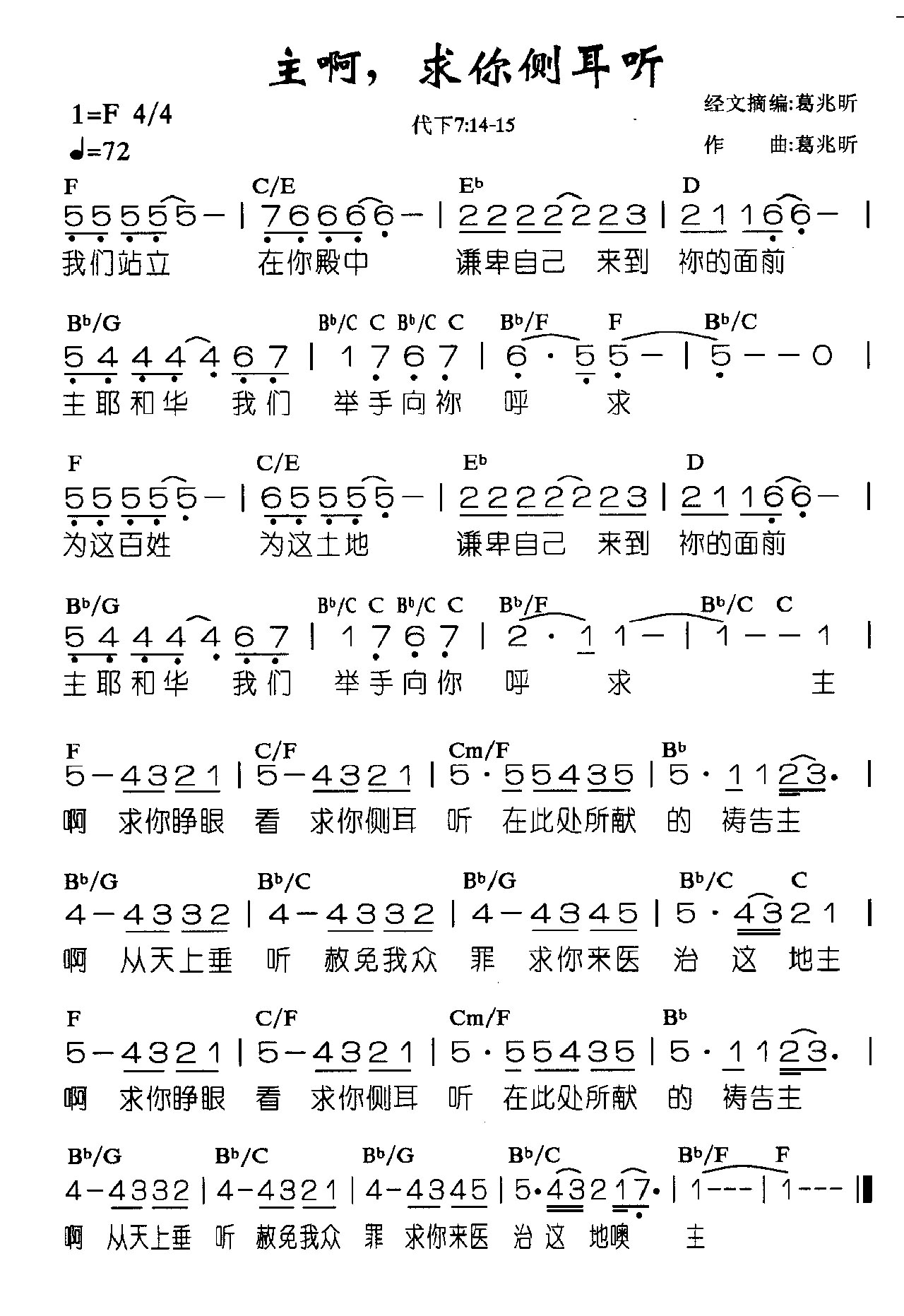 主啊,求你侧耳听简谱上传者为网友上传,原创作者为网络转载,歌曲原唱歌手为佚名,本简谱为图片格式,表现形式为,音乐性质为流行金曲。