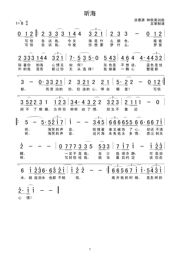 听海简谱上传者为网友上传,原创作者为网络转载,歌曲原唱歌手为佚名,本简谱为图片格式,表现形式为,音乐性质为流行金曲。