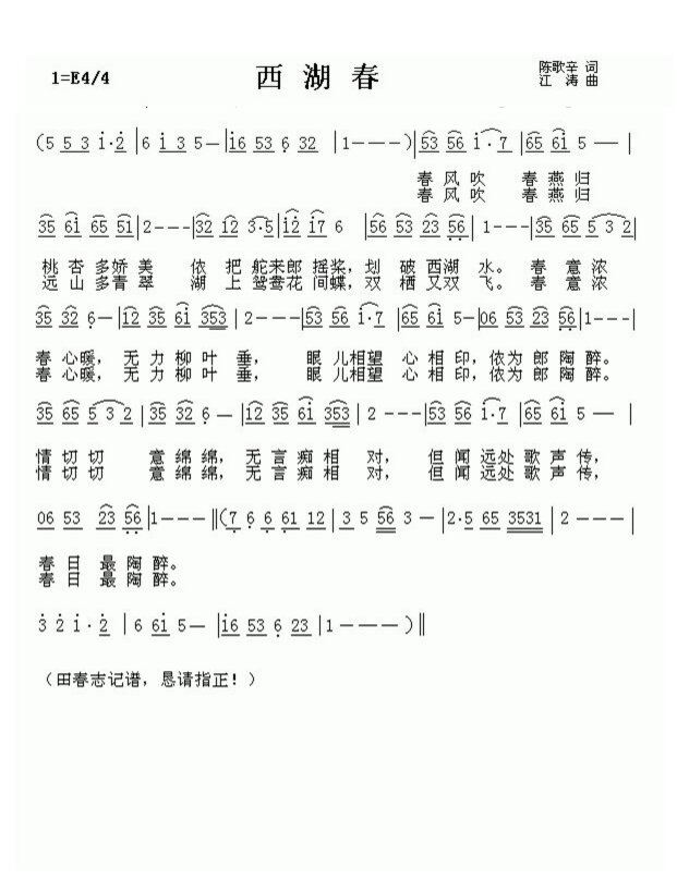 西湖春简谱上传者为网友上传,原创作者为网络转载,歌曲原唱歌手为佚名,本简谱为图片格式,表现形式为,音乐性质为流行金曲。