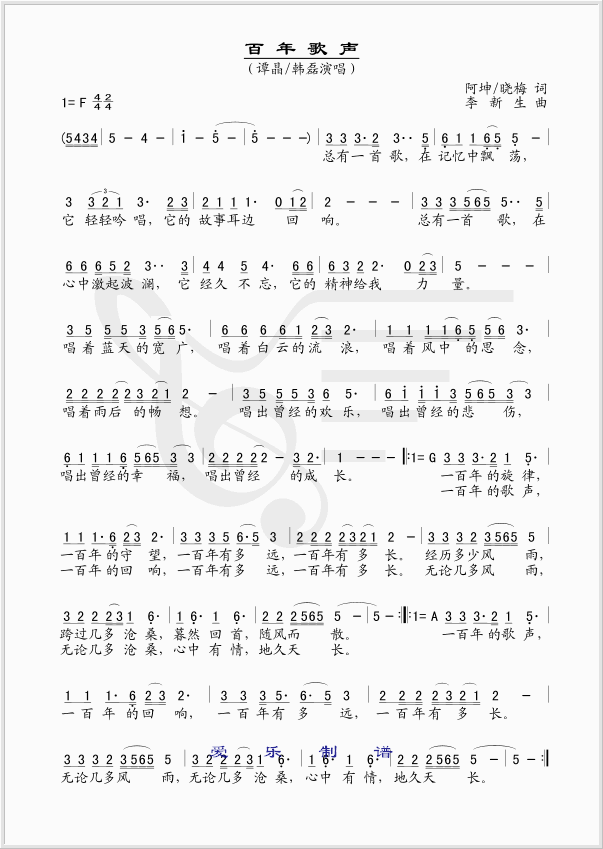 百年歌声简谱上传者为网友上传,原创作者为网络转载,歌曲原唱歌手为佚名,本简谱为图片格式,表现形式为,音乐性质为流行金曲。