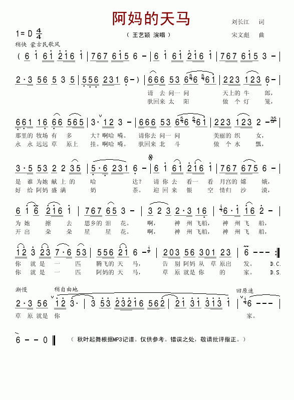 阿妈的天马简谱上传者为网友上传,原创作者为网络转载,歌曲原唱歌手为佚名,本简谱为图片格式,表现形式为,音乐性质为流行金曲。