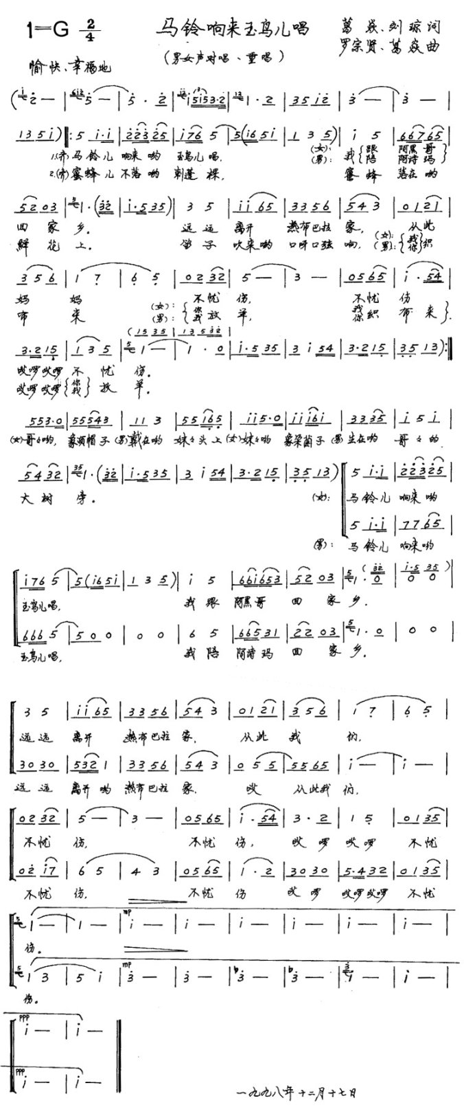 马铃响来玉鸟儿唱简谱上传者为网友上传,原创作者为网络转载,歌曲原唱歌手为佚名,本简谱为图片格式,表现形式为,音乐性质为流行金曲。