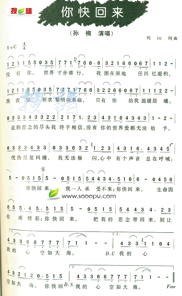 你快回来简谱上传者为网友上传,原创作者为网络转载,歌曲原唱歌手为佚名,本简谱为图片格式,表现形式为,音乐性质为流行金曲。