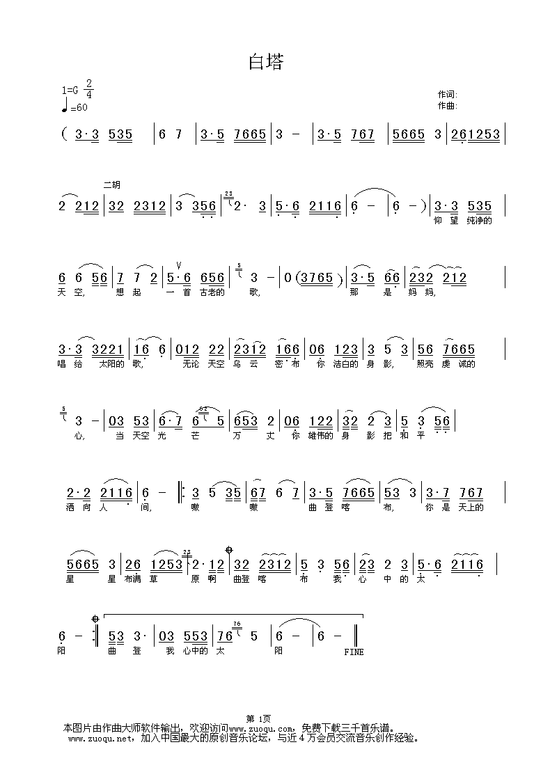北塔简谱上传者为网友上传,原创作者为网络转载,歌曲原唱歌手为佚名,本简谱为图片格式,表现形式为,音乐性质为流行金曲。