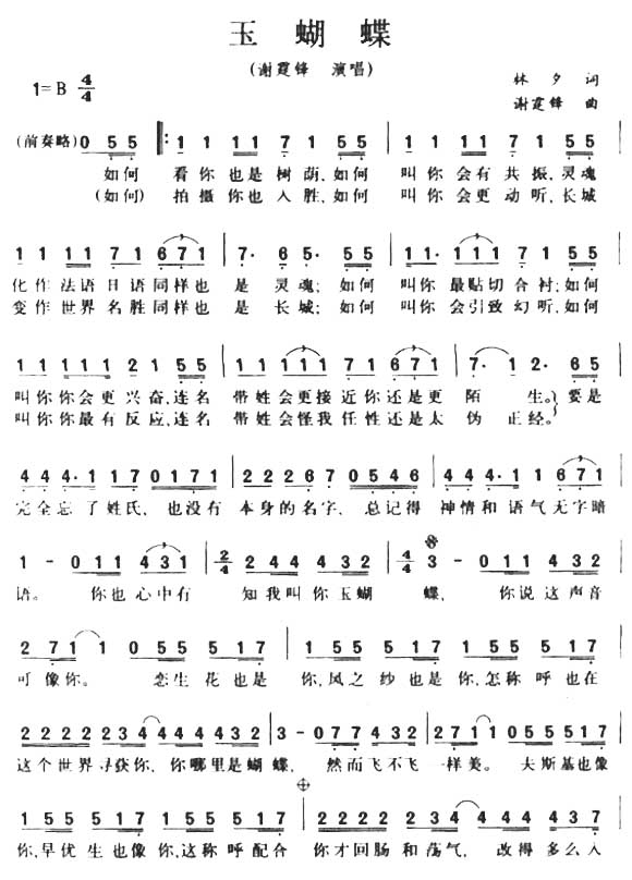 玉蝴蝶简谱上传者为网友上传,原创作者为网络转载,歌曲原唱歌手为佚名,本简谱为图片格式,表现形式为,音乐性质为流行金曲。