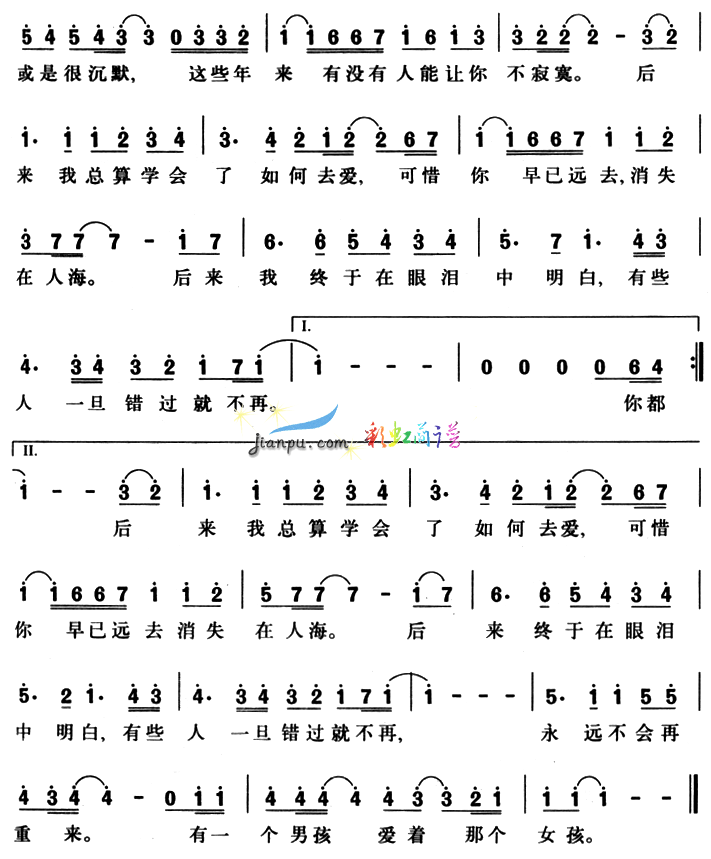 后来简谱上传者为网友上传,原创作者为网络转载,歌曲原唱歌手为佚名,本简谱为图片格式,表现形式为,音乐性质为流行金曲。