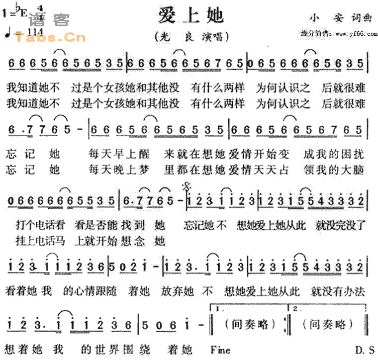 爱上她简谱上传者为网友上传,原创作者为网络转载,歌曲原唱歌手为佚名,本简谱为图片格式,表现形式为,音乐性质为流行金曲。