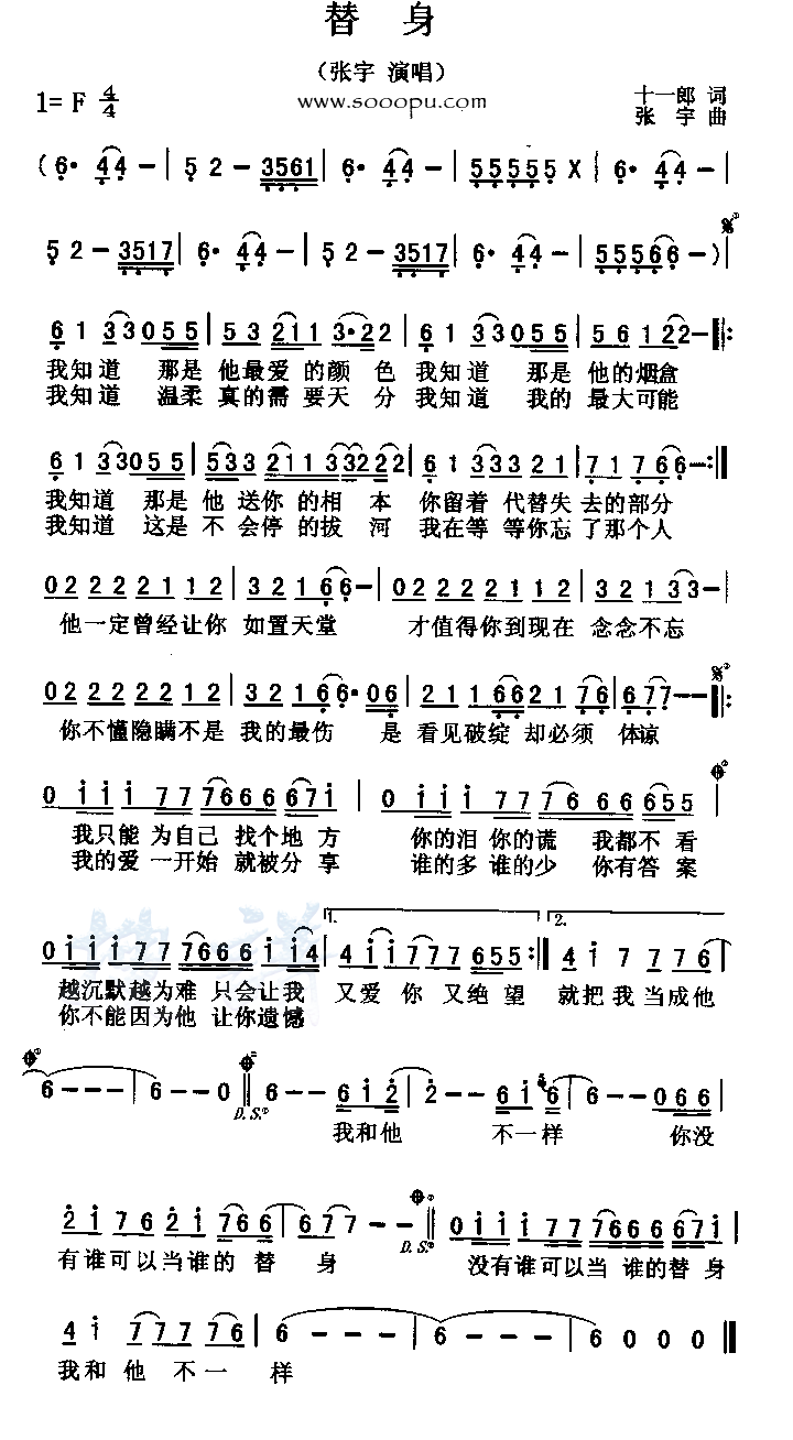 替身简谱上传者为网友上传,原创作者为网络转载,歌曲原唱歌手为佚名,本简谱为图片格式,表现形式为,音乐性质为流行金曲。
