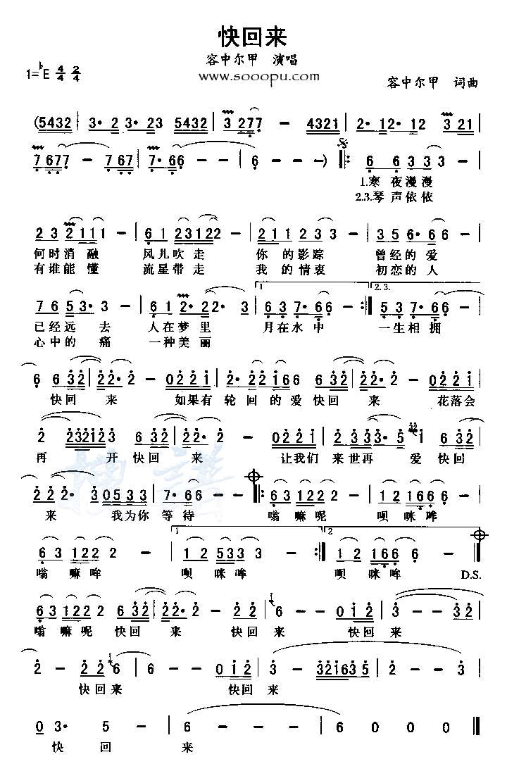 快回来简谱上传者为网友上传,原创作者为网络转载,歌曲原唱歌手为佚名,本简谱为图片格式,表现形式为,音乐性质为流行金曲。