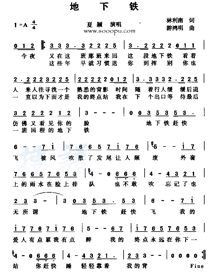 地下铁简谱上传者为网友上传,原创作者为网络转载,歌曲原唱歌手为佚名,本简谱为图片格式,表现形式为,音乐性质为流行金曲。
