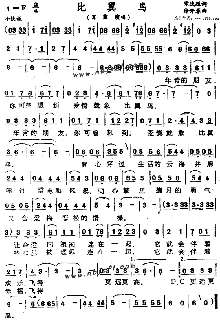 比翼鸟简谱上传者为网友上传,原创作者为网络转载,歌曲原唱歌手为佚名,本简谱为图片格式,表现形式为,音乐性质为流行金曲。