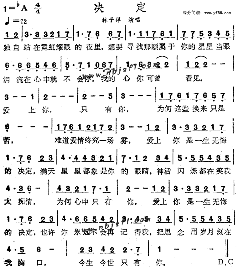 决定简谱上传者为网友上传,原创作者为网络转载,歌曲原唱歌手为佚名,本简谱为图片格式,表现形式为,音乐性质为流行金曲。