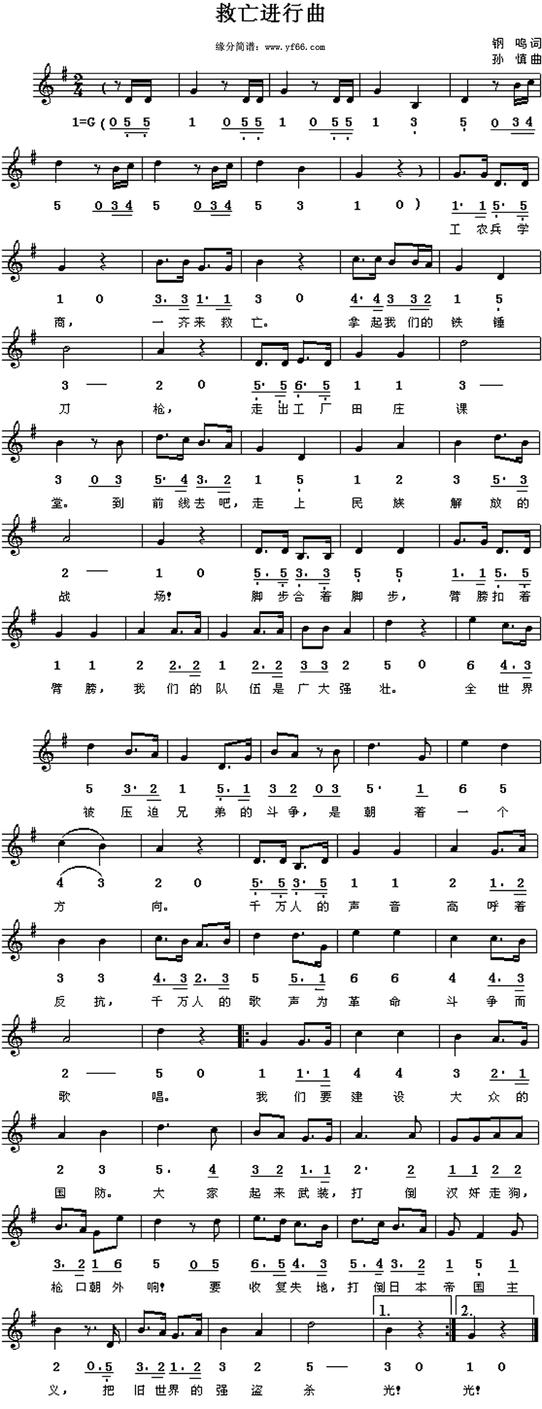 救亡进行曲简谱上传者为网友上传,原创作者为网络转载,歌曲原唱歌手为佚名,本简谱为图片格式,表现形式为,音乐性质为流行金曲。